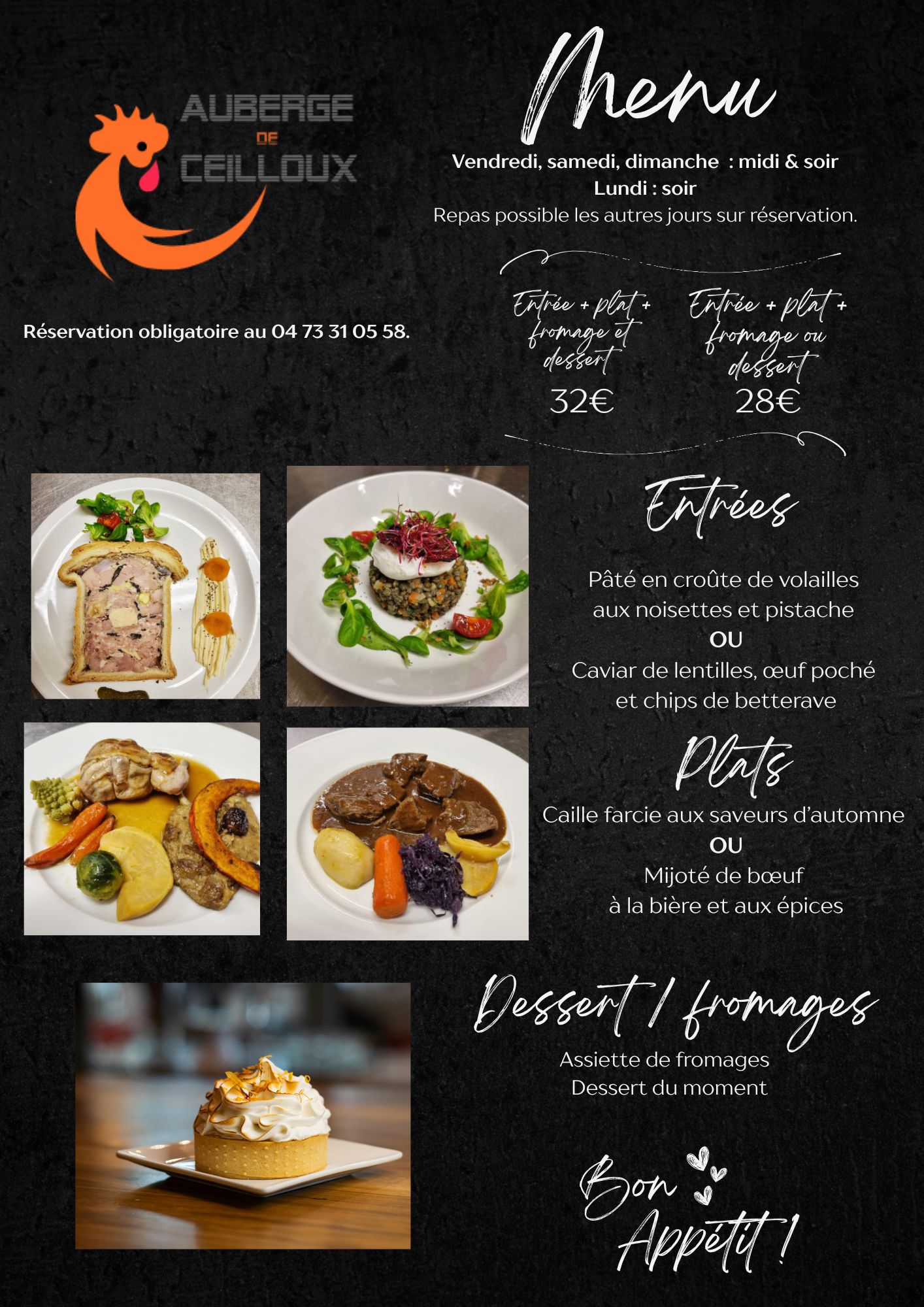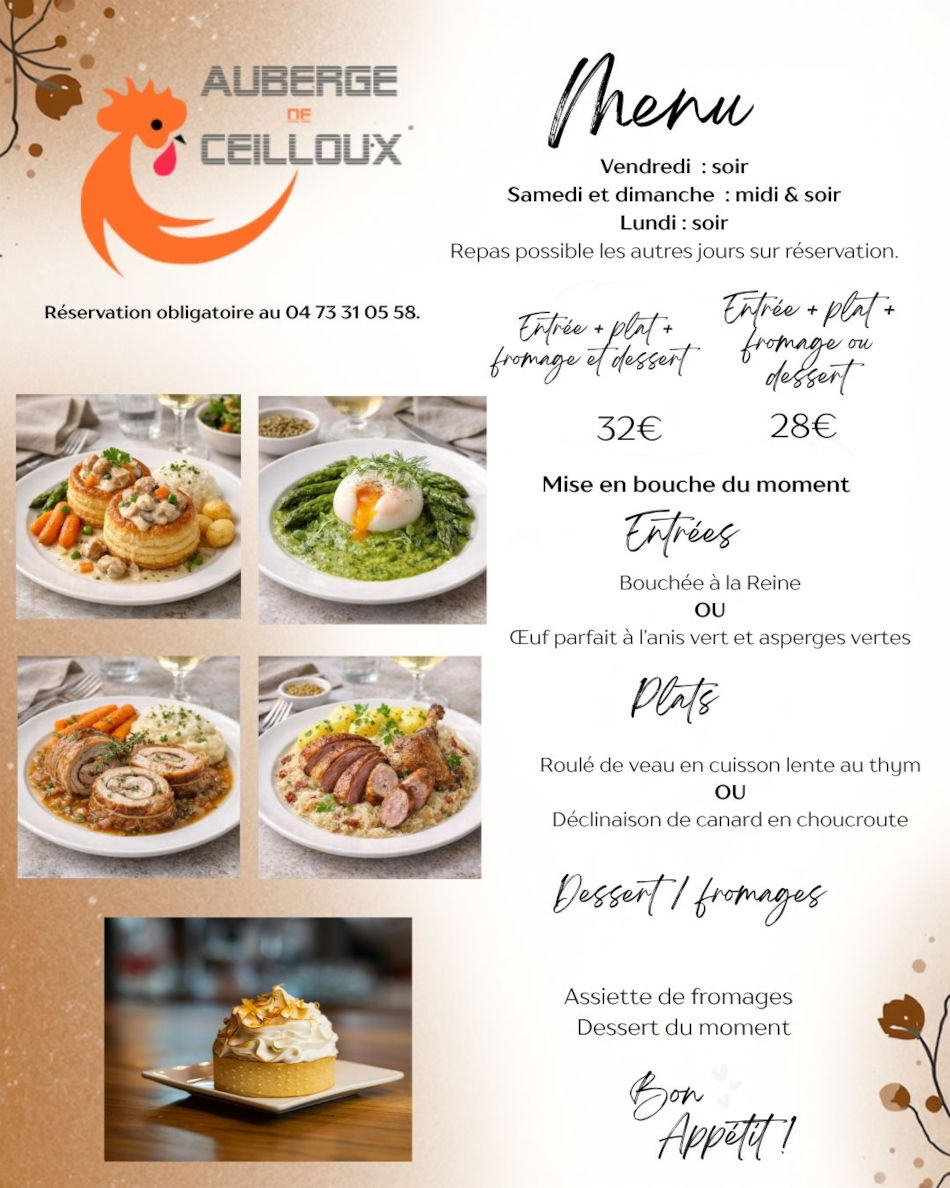 Franck Fayolle vous accueille à l’auberge de Ceilloux avec une cuisine traditionnelle auvergnate revisitée, accompagnée de produits locaux et de saison.