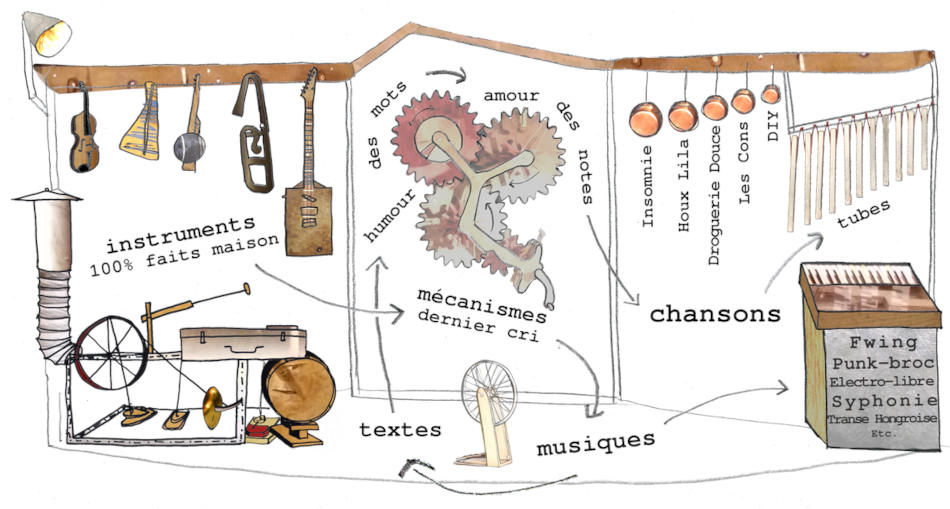 Mécanismes sonores, engrenages, lutherie inventive et empirique, objets divers pour musique artisanale : dans son atelier, la compagnie Bric à Brac Orchestra a, durant trois ans, imaginé et fabriqué le terrain de jeu insolite de ce spectacle.