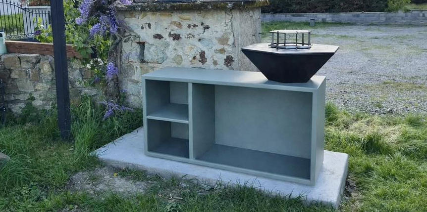 Nouveau brasero Thiernois sur un socle d’1m50, permettant la préparation des aliments, à côté de l’espace de cuisson.