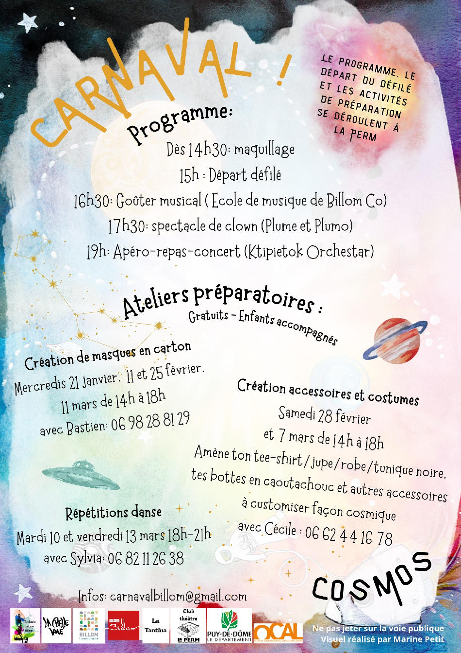 Le carnaval aura lieu à partir de 14 h 30, à La Perm à Billom, samedi 14 mars 2026.