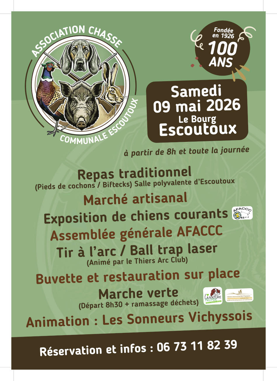 À l’occasion du centenaire de la Société de chasse, la commune d’Escoutoux ne célèbre pas seulement son histoire : elle regarde aussi vers l’avenir. Parmi les temps forts de cette journée du 9 mai, la marche verte s’impose comme une initiative à la fois simple, utile et profondément citoyenne.