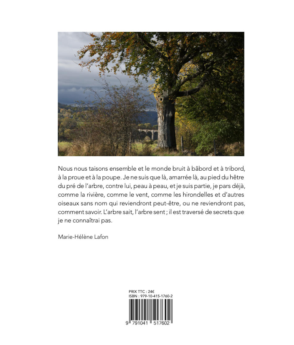 « Nous nous taisons ensemble et le monde bruit à bâbord et à tribord, à la proue et à la poupe. Je ne suis que là, amarrée là, au pied du hêtre du pré de l’arbre, contre lui, peau à peau, et je suis partie, je pars déjà, comme la rivière, comme le vent, comme les hirondelles et d’autres oiseaux sans nom qui reviendront peut-être, ou ne reviendront pas, comment savoir. L’arbre sait, l’arbre sent ; il est traversé de secrets que je ne connaîtrai pas. »