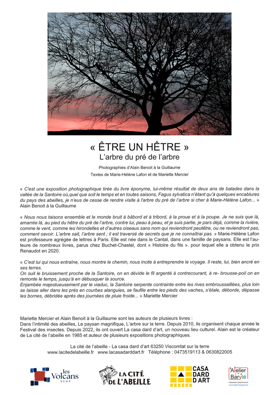 « C’est une exposition photographique tirée du livre éponyme, lui-même résultat de deux ans de balades dans la vallée de la Santoire où, quel que soit le temps et en toutes saisons, Fagus sylvatica n’étant qu’à quelques encablures du pays des abeilles, je n’eus de cesse de rendre visite à l’arbre du pré de l’arbre si cher à Marie-Hélène Lafon... » Alain Benoit à la Guillaume