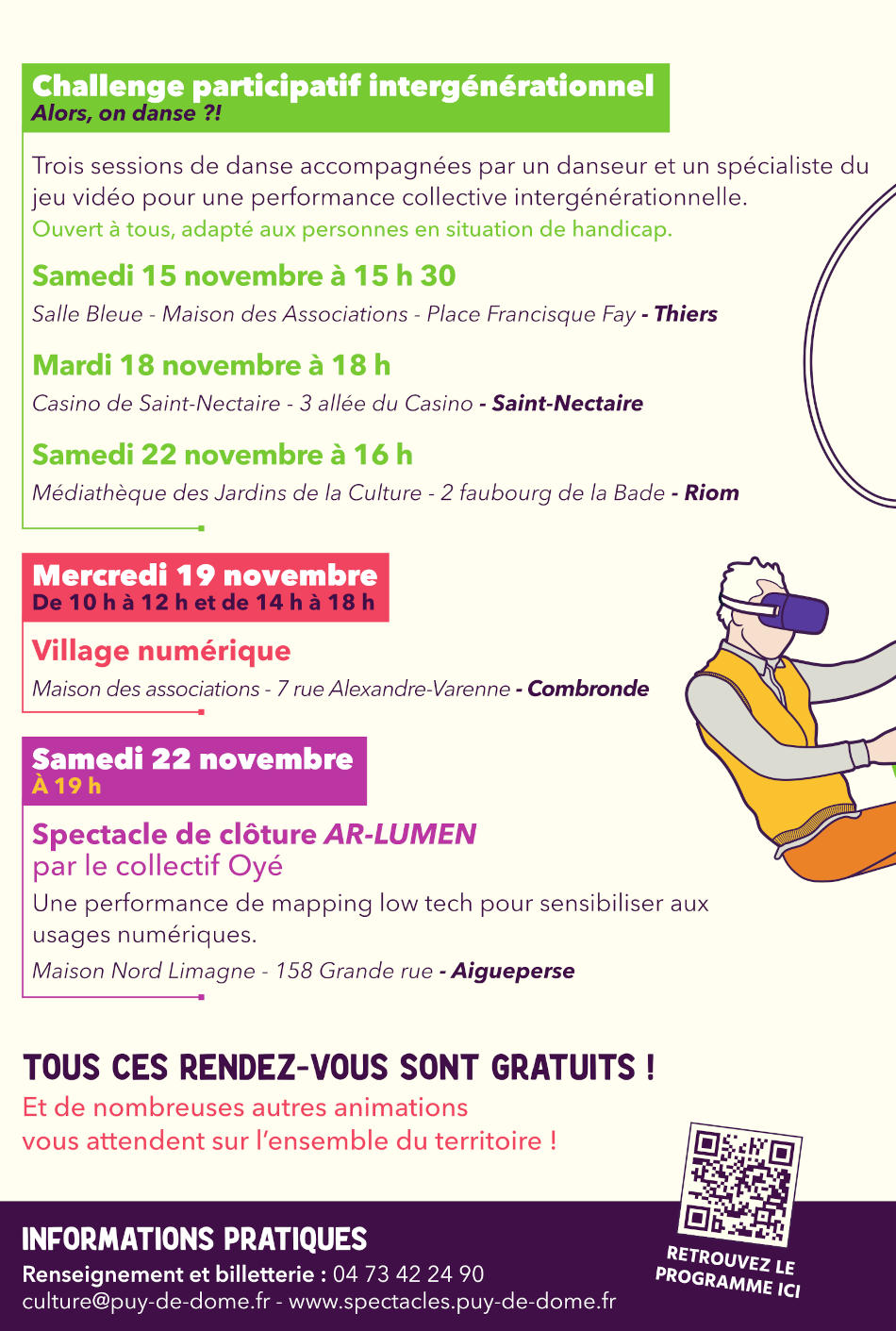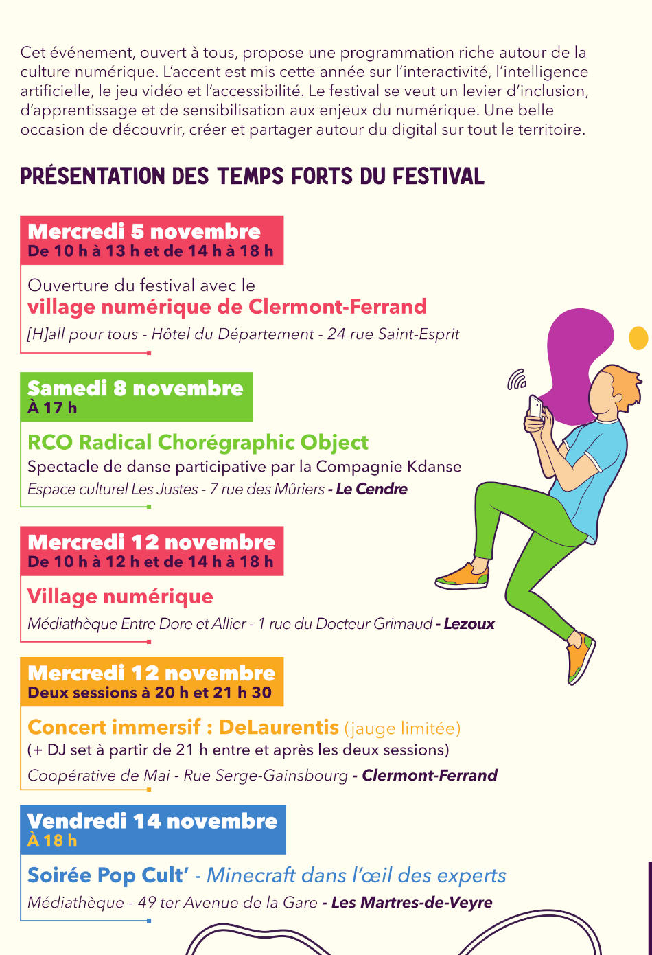 Le festival s’adresse à tous les publics : jeunes, familles, seniors, personnes en situation de handicap… chacun trouvera une expérience à son goût ! Que vous soyez passionnés de gaming, curieux de plonger dans le patrimoine via la réalité virtuelle ou augmentée, intéressés par la fabrication numérique ou soucieux des défis écologiques liés au digital, Connexions 2025 vous propose autant d’activités captivantes réparties sur tout le territoire du Puy-de-Dôme.