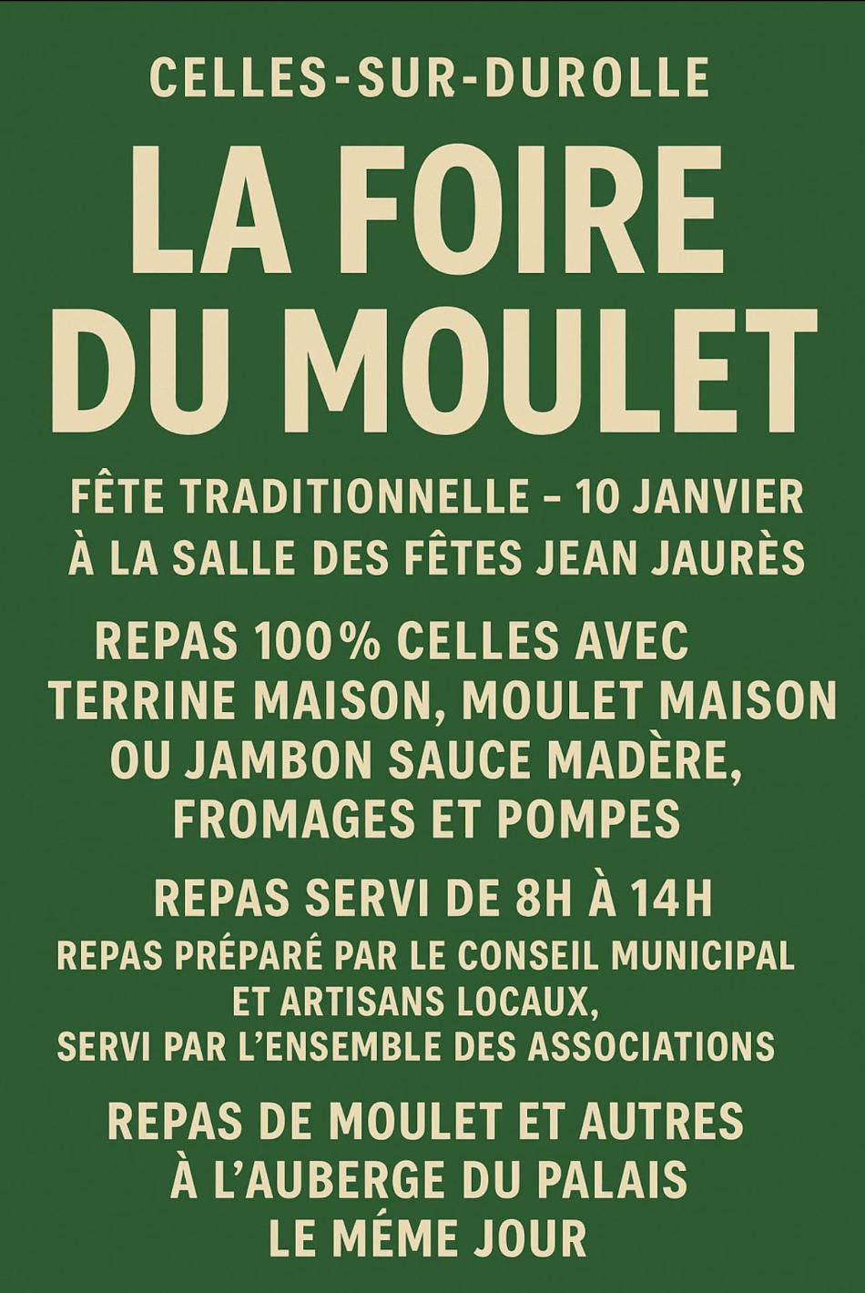 La Foire du Moulet se tiendra le 10 janvier 2026, de 8 h à 14 h à la salle des fêtes de Celles-sur-Durolle.