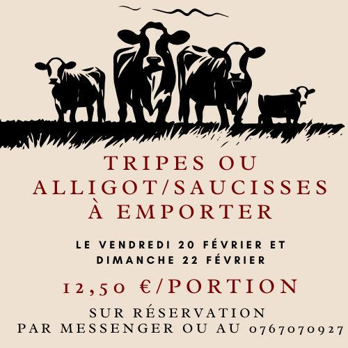 Dimanche 22 février, dimanche spécial chez Gourmandise & Cie ! Vous êtes également les bienvenus pour venir partager votre repas sur place : terrine, tripes ou saucisse alligot, dessert au choix : 12 euros. À partir de 9 h.