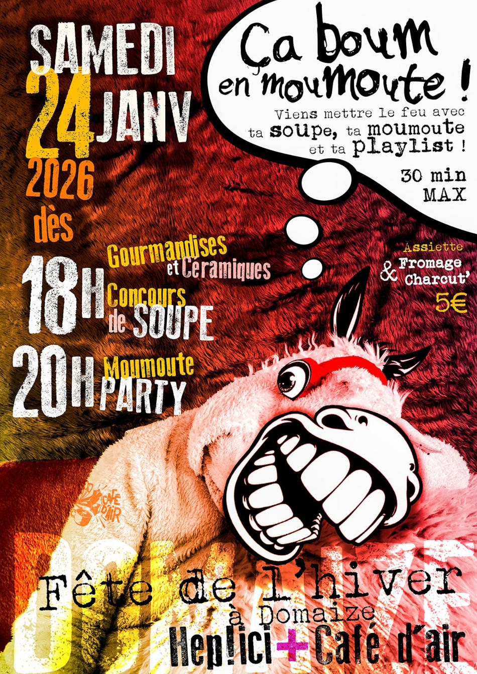 20 h : moumoute party. Ça Boum en moumoute ! Viens mettre le feu avec ta soupe, ta moumoute et ta playlist ! 30 min max.