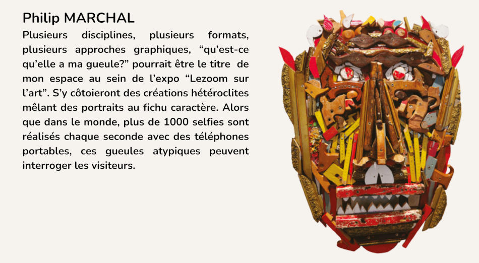 Lezoom sur l’art présentera différentes disciplines (peinture, sculpture, photographie, collage, dessin,…) rappelant ainsi la vitalité de l’art et l’impulsion créatrice. Cette année, 4 temps forts sont proposés au public pour découvrir l’art sous une autre forme. Il n’est pas utile d’avoir déjà pratiqué. Tout le monde peut s’autoriser une expérience unique et artistique.