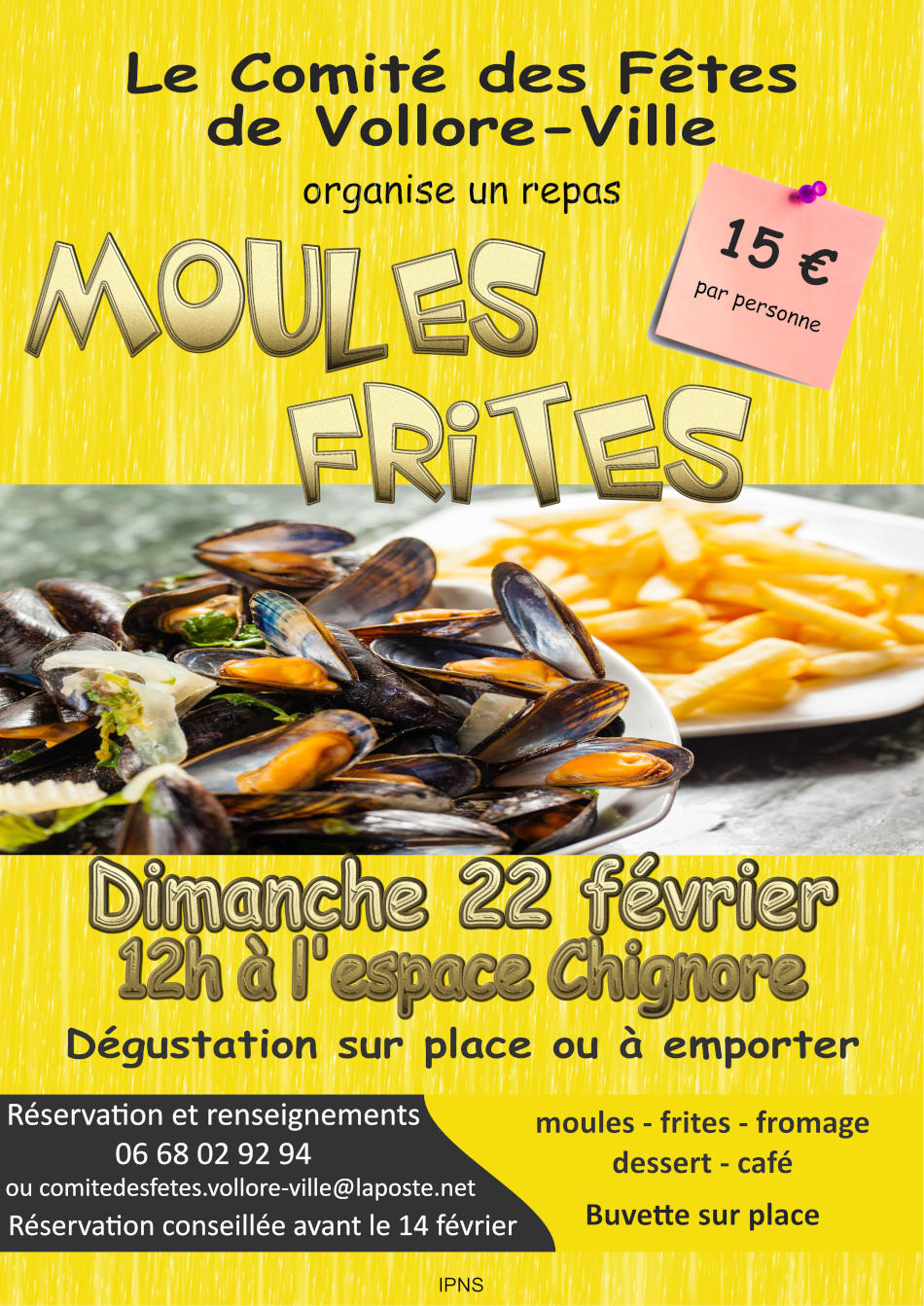 Le Comité de Fêtes de Vollore-Ville vous donne rendez-vous pour ses traditionnelles moules-frites, dimanche 22 février 2026, à l’Espace Chignore à Vollore-Ville.