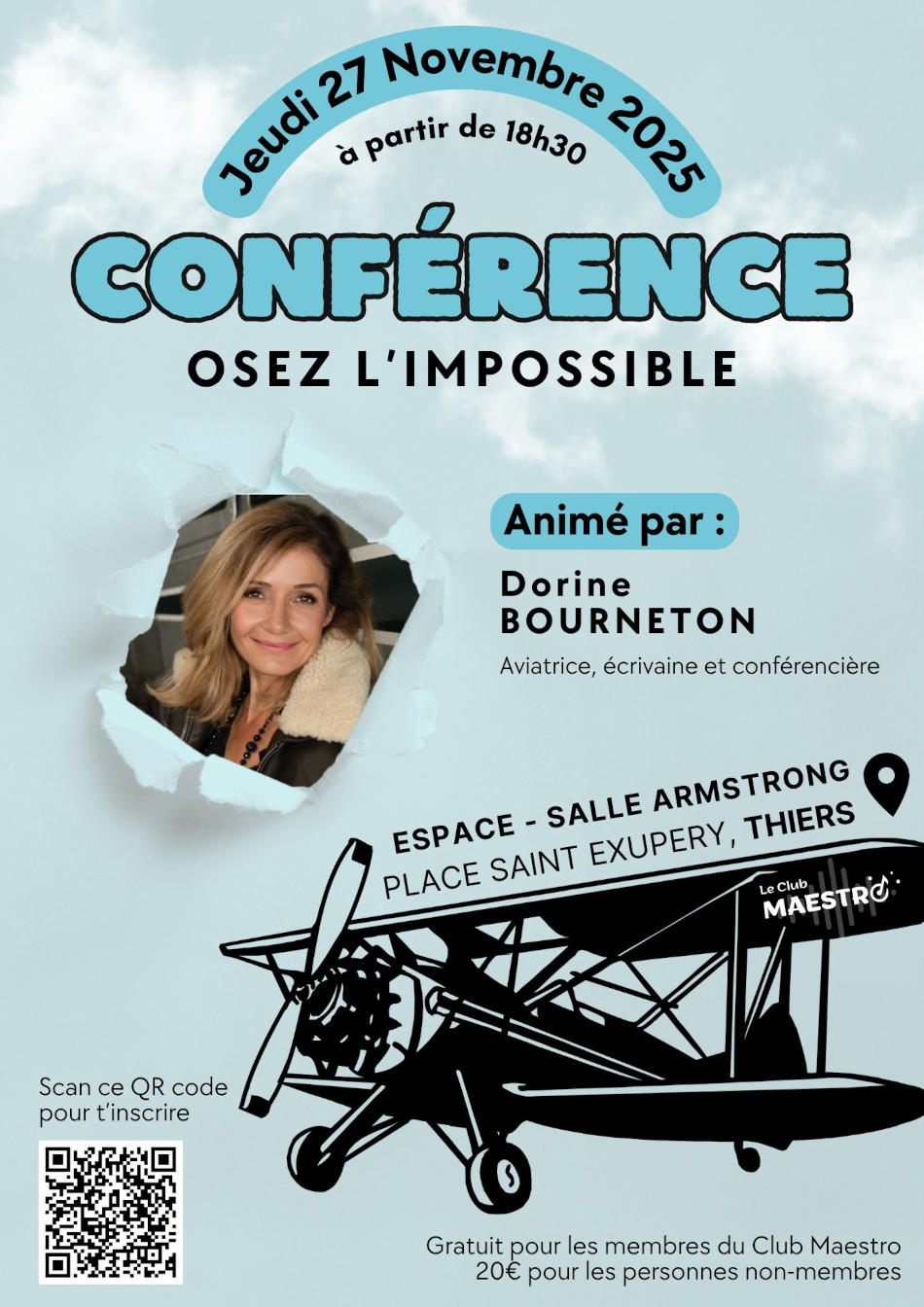 Le Club Maestro reçoit Dorine Bourneton, aviatrice, écrivaine et conférencière. Devenue pilote de voltige après un accident survenu à l’âge de 16 ans, elle est la première femme en situation de handicap à avoir réalisé une démonstration au Salon du Bourget, événement aéronautique international.