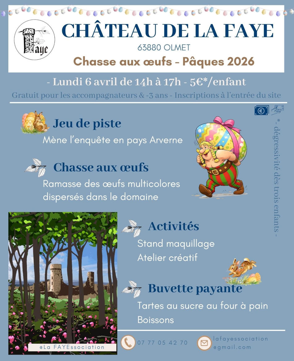 En déambulant dans les vestiges du Château de La Faye, vous collecterez des indices et des œufs multicolores (panier fourni). Une récompense en chocolats de Pâques et une boisson attendent tous les enfants participants (5€ par enfant - gratuit pour les moins de 3 ans - entrée libre pour les accompagnants).