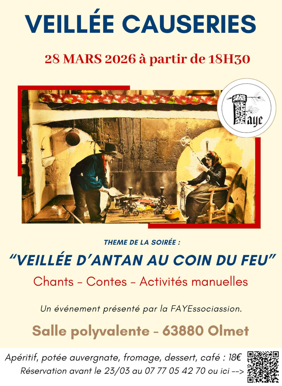 Repas animé à la façon d’une veillée d’antan au coin du feu, samedi 28 mars 1016, à 18 h 30, salle polyvalente d’Olmet.