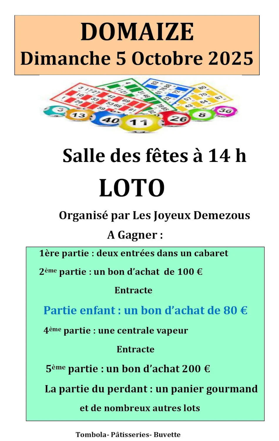 Les Joyeux Demezous vous invitent à leur loto, dimanche 5 octobre 2025, à 14 h, à la salle des fêtes de Domaize.
