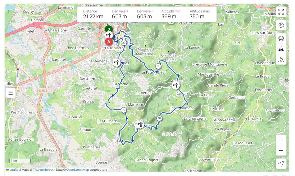 Découvrez ce parcours de randonnée de 21,2 km à proximité de Thiers. Il présente une ascension cumulée de plus de 600m. Prévoyez environ 6 heures et 50 minutes pour réaliser ce parcours.