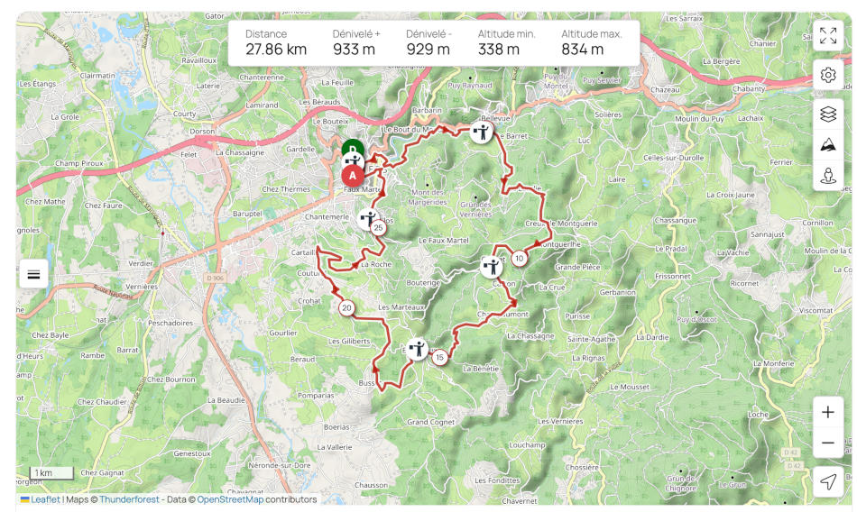 Découvrez ce parcours de randonnée de 27,9 km à proximité de Thiers. Il présente une ascension cumulée de plus de 930m. Prévoyez environ 9 heures et 25 minutes pour réaliser ce parcours.