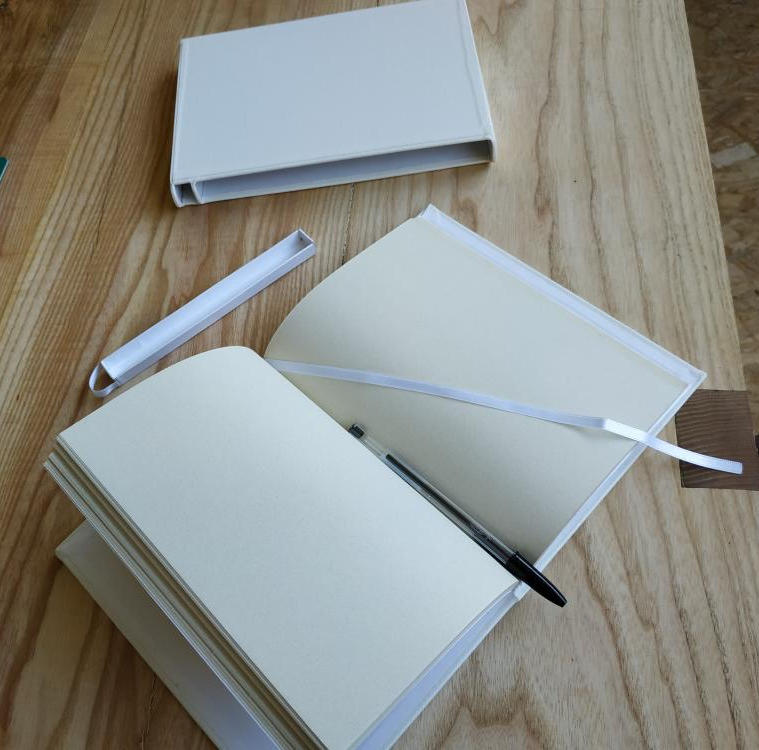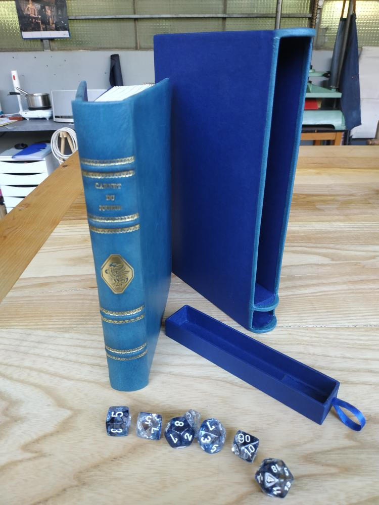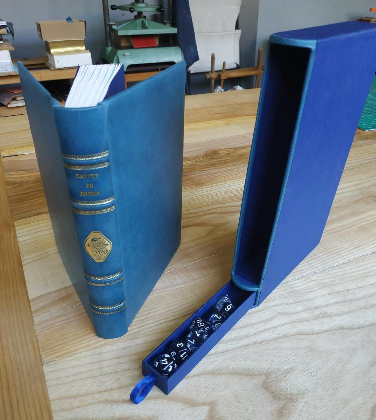 Sur demande, et sur mesure, il peut vous proposer la confection de jolis carnets reliés, où vous choisirez la couleur, le cuir, le fleuron, et le titre que vous souhaitez lui donner.