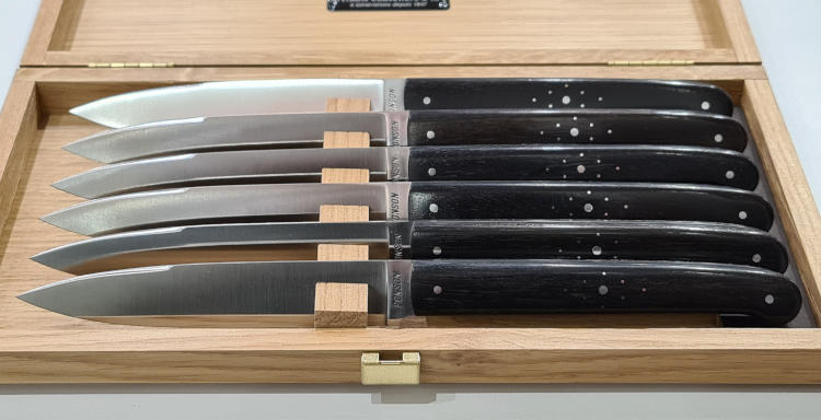Mes couteaux de table sont nos modèles : Le Chignore® de table, présent sur les tables de Chefs Etoilés, Le Serge Vieira® de table, présent sur les tables de Serge Vieira, au Château de Couffour, Le O® pour les tables d’Olivier Arlot La Chancelière, Le Flo® pour la table de Dan Arnold (Australie). Et notre interprétation Couteau Forgé Inox Monobloc LE THIERS®.