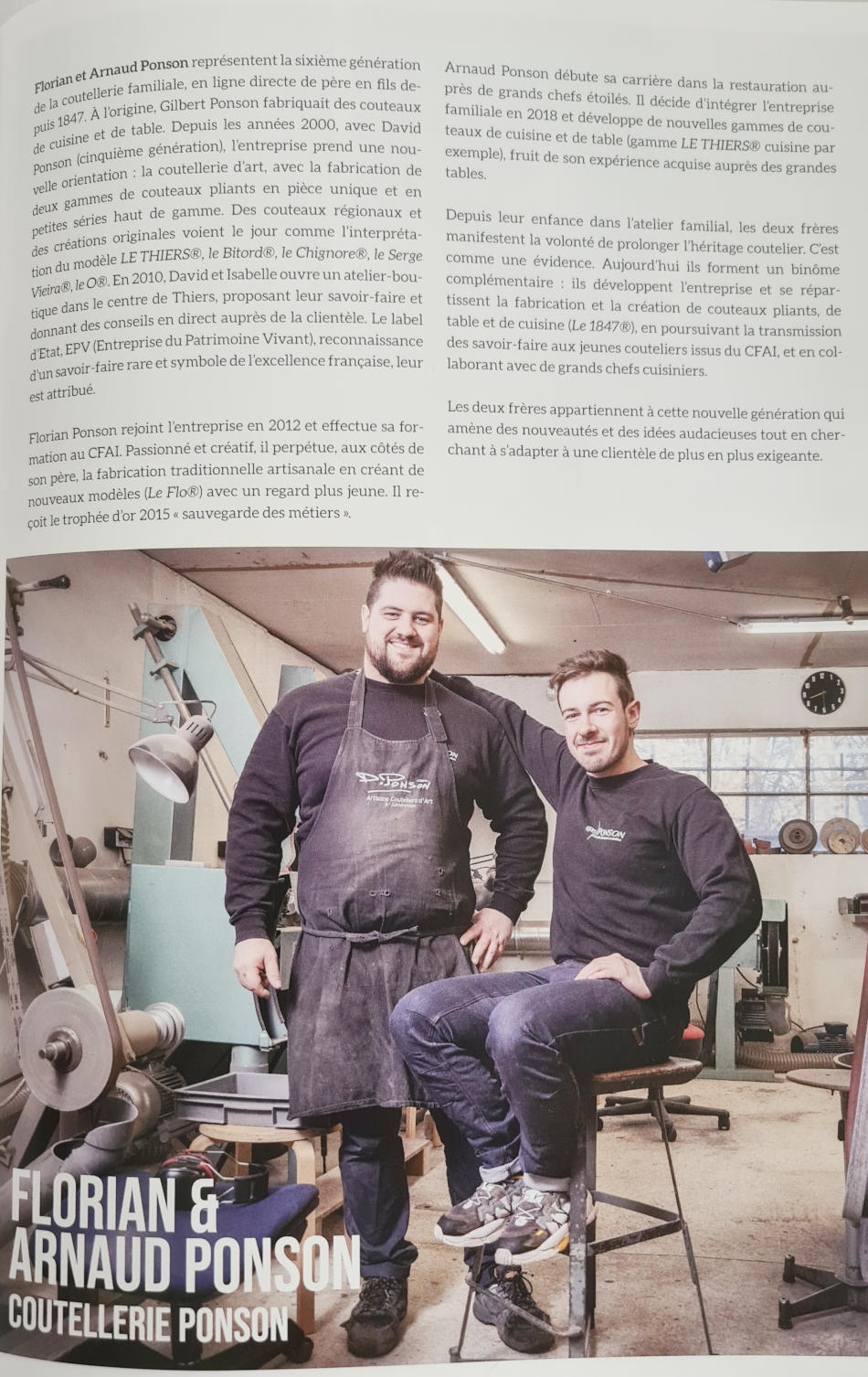 Coutelier de tradition, puisqu’il est issu d’une famille de professionnels, David Ponson l’est également par sa formation, avec quinze ans d’expérience préalable à son installation comme artisan d’art. David Ponson et ses deux fils, Florian et Arnaud, perpétuent cette tradition, tout d’abord par la fabrication de couteau custom (pièce unique réalisée à la main) puis par la petite série : pliant, table et cuisine, avec des matériaux nobles, acier damas… Leur talent est grand et la presse spécialisée ne s’y est pas trompée ! Des magazines comme La passion des couteaux ou bien encore Excalibur, qui sont un peu les Évangiles des amateurs et collectionneurs de couteaux, leur ont largement ouvert leurs colonnes dernièrement. Ils étaient grands, ils le sont encore plus ce qui n’est que justice. Le plus simple – et le plus beau – est d’aller sur place, dans la boutique, découvrir leur production. Et en plus, ils sont sympas !
